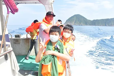 船長讓孩子們觀察東澳灣的定置網,我們也看到飛魚在海面飛起,船長介紹「東澳水產動植物繁殖保育區」,保育區範圍包含自粉鳥林漁港溪邊到東澳灣尾處峽角往北延伸的海域,其中還設立了完全禁漁區,此外,為了養護當地的海膽資源,每年有限制可採捕人數與採捕量,且需預先申請。