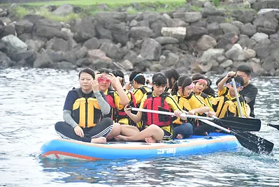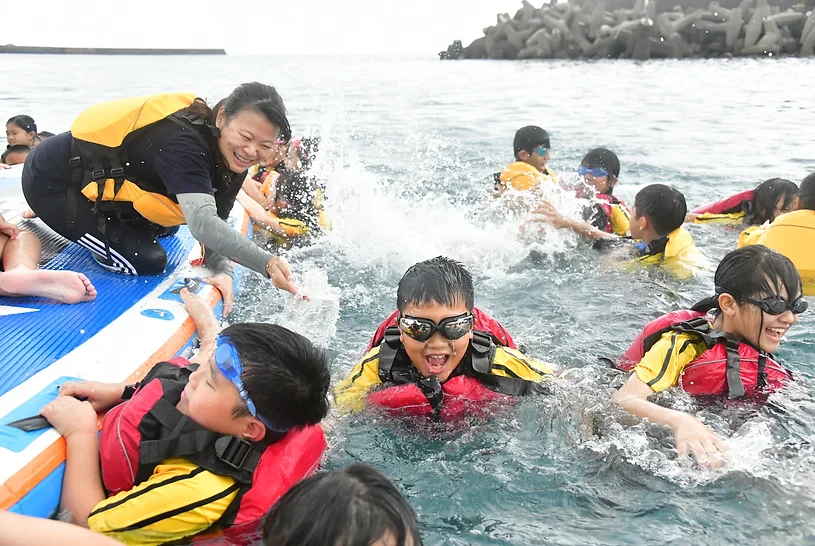 我們前往豆腐岬看到了美麗的小海灣,到豆腐岬中體驗划SUP龍舟板的樂趣,由張正成教練群進行SUP龍舟板運動說明與操槳教學練習,首先進行水上安全救生與水域安全宣導,學生分組划SUP龍舟板,期間孩子們均穿著救生衣實際上舟操作,孩子們乘著SUP龍舟板在大海上聽著一波波的浪濤潮汐拍打聲,在歡樂的笑聲下划著SUP龍舟板親近海洋。孩子們划累了,就在海灘淺水處開始戲水玩得好高興。
