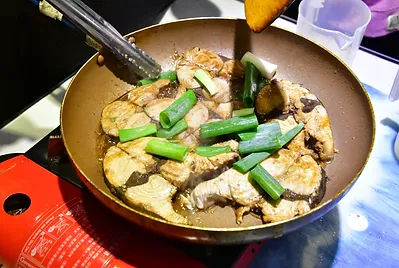 這次讓孩子們試做的煙仔虎與長腰鮪兩吃有煎魚排、薑絲魚湯,煎魚排材料有煙仔虎(長腰鮪)、沙拉油、鹽、米酒。作法將煙仔虎(長腰鮪)輪切灑上少許胡椒鹽,油鍋熱了就放下去煎,大火將魚皮煎略黃定型後以中火慢煎至熟,再翻面同樣方法再煎。薑絲魚湯有材料煙仔虎(長腰鮪)魚頭、魚皮等魚雜、薑絲、蔥花、鹽、味精、米酒、香油、白胡椒粉。作法先把煙仔虎(長腰鮪)魚頭、魚皮等魚雜切成小塊狀,再準備一鍋滾水汆燙一下表層變白即可撈起,再來倒掉鍋中水後洗乾淨再加入滾水,等湯滾開之後持續把浮在水上的雜物撈起,這樣湯汁會比較鮮美,之後放入薑絲煮一下,關小火後再加點鹽、白胡椒粉,最後關火加入一大匙米酒即可,準備碗內裝蔥花與香油再把魚湯倒入碗中,這樣就完成煮魚湯。這冷冷的天裡喝到熱騰騰的魚湯真是暖心啊!而最後的醬燒煙仔虎與長腰鮪魚排更是大滿足!