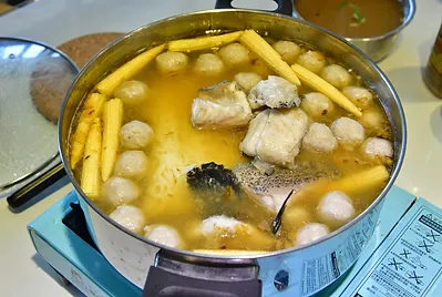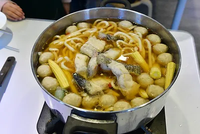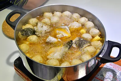 指導孩子們起鍋熱少許油,放入石斑魚肉煎香,加入蔥、虱目魚丸、芹菜後,灑米酒去腥倒入1.5公升雞高湯滾後轉中小火放入米粉和油麵、烏龍麵、冬粉,讓米粉和麵等吸附魚高湯,孩子們的湯頭還有泰式酸辣、味增柴魚、蕃茄糖醋等口味,石斑魚肉質口感細嫩中帶有咬勁,美味又營養,將鮮甜的石斑湯汁及調味料的醬香吸飽飽,一口石斑肉再一口米粉與麵,好吃得沒話說!米粉與麵與魚肉鮮味完美融合,在口中散發香氣,教人意猶未盡,一口接一口相當過癮。