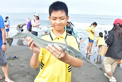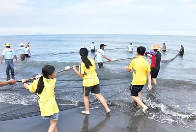 早期宜蘭有句諺語『武荖坑大石鼓、阿兼城水查某、大坑罟臭魚脯』,正描述早年社區牽罟捕魚產業的興盛。孩子們拿著漁獲拍照後,在海灘戲水一下,結束了今天海洋教育的假日之旅。