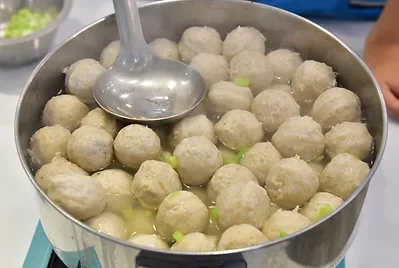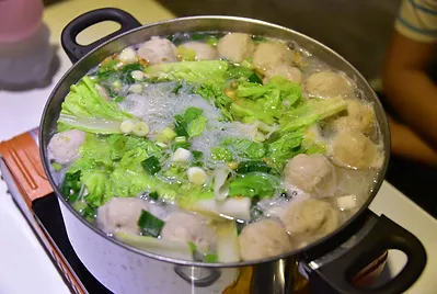 起鍋燒開水,飛烏虎魚丸放下去煮,煮滾後再加入油蔥酥與芹菜珠,加入幾滴香油與胡椒鹽。