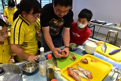 接下來要在灃食食育教室進行食魚教育課程,由五忠孩子們來進行食魚教育課程,看到孩子們日漸熟練的廚藝,享受鮮魚料理濃郁的鮮香,加上慢慢釋放出來的甜味,會讓人一口接一口停不下來。這次讓孩子們自己動手切魚,將魚以煮湯、乾煎等方式製作成美味的魚料理,從一開始孩子們討厭魚腥味、魚血和內臟,到後來飄出誘人的香味後,每位孩子認真的烹煮,最後把所有魚料理狼吞虎嚥統統吃光光。