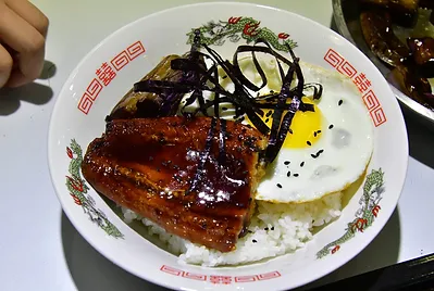 蒲燒鰻退冰後,使用烤箱200度烤3~5分鐘,烤後的鰻魚,直接放在白飯上,淋上蒲燒鰻魚醬汁,鹹鹹甜甜的調味超下飯,加入荷包蛋丶海苔絲點綴,最後撒上芝麻就可以享用了!