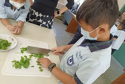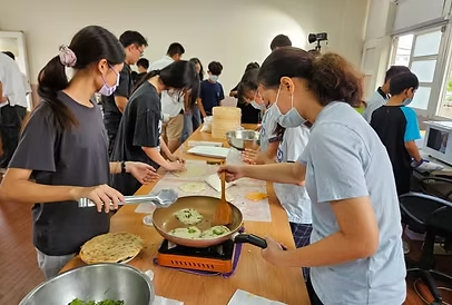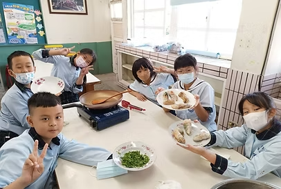 香菜在北斗的飲食文化裡十分普遍,學校也有栽種香菜,校長搭配外師進行雙語課程,嘗試將香菜加到料理之中,讓孩子能接受香菜的味道。校長帶著孩子試做「香菜春捲」,引導孩子從香菜的切碎處理,到包進餡料當中,接著放到平底鍋裡煎熟。在大廚帶小廚的烹調料理功夫後,一卷卷香噴噴的「菜捲」裝盤,看著孩子吃著津津有味,肯定很美味啊!