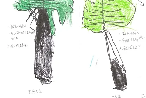 經過小孩近距離的觀察與紀錄,孩子們發現黑夜白菜的葉脈比較少、莖比較粗的底部按下去會翹起來、而且黑夜白菜葉子的顏色都比較深色。小白菜的葉子顏色都比較淺、葉脈比較少、它的梗也比較瘦、葉子有大波浪的造型。