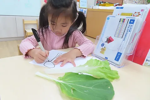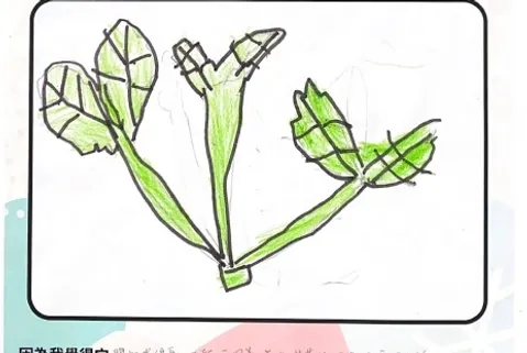 我們先看看,今天中午會遇見什麼菜呢?就是它們——小白菜和黑葉白菜,孩子觀察葉子有海浪的形狀、有芭樂的氣味、有瘦瘦和胖胖的梗,孩子把觀察到的地方用圖像的方式記錄下來。