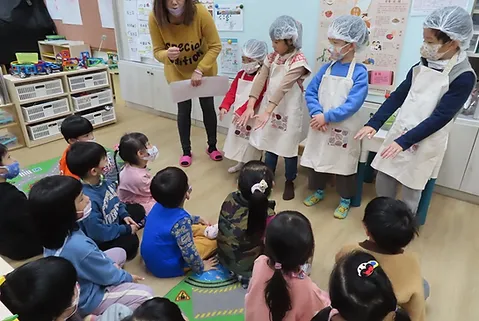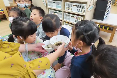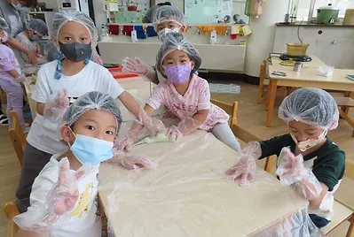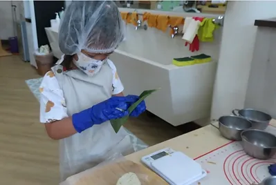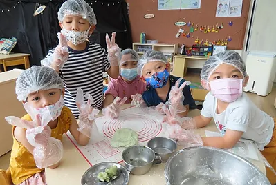 小朋友最近開始製作客家菜包,一開始他們只加糯米粉、糖、艾草泥、水,他們在試吃的過程中,發現外皮沒有外面買的好吃,外面買的粿皮比較Q,因此他們一起尋找讓粿皮變Q的秘訣,有一次在午睡前,他們看到製作客家菜包影片,其中有一個步驟是我們沒有的,就是把部分粿皮下去煮,在與生粿皮混合一起;另外,他們也發現我們之前做粿皮時,少加少許在來米粉與油,他們也對配方進行調整,經過一再調整與試吃的過程,終於完成小朋友滿意的粿皮。