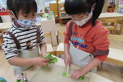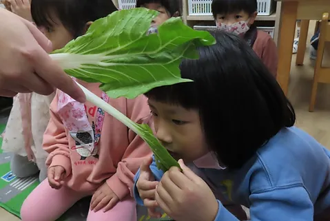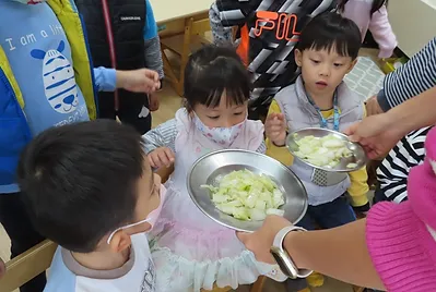 老師每日都會介紹午餐的蔬菜,藉由這樣的活動,讓小朋友認識食物的原形,並請小朋友用眼睛觀察蔬菜的外觀、用手觸摸感覺它的質地、用鼻子聞蔬菜的味道,午餐時在品嚐食物的味道,經過幾天的認識,小朋友對蔬菜有初步的認識,知道我們吃的蔬菜是它的莖葉部分,也知道怎麼處理蔬菜。