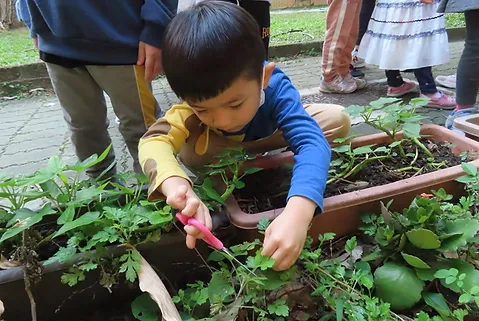 上週我們到靜心湖小朋友發現艾草,而艾草有獨特的味道,且又是可食的植物,小朋友想在校園栽種它,因此老師訂了許多艾草盆栽,當好盆栽在312植樹節送來,於是小朋友在這一天體驗當小農夫,他們從整地開始,將雜草與其他的菜根從泥土挑出來,之後分別在泥土挖一個大洞,並學習如何在不傷害艾草的情況下,將艾草從盆栽取出種在泥土裡。