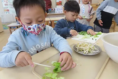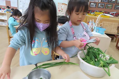 孩子到烹飪區將蔥剪碎,中午搭配飯吃,發現生蔥沒有煮過的味道很辣、像蒜頭的辣。而煮過的蔥和豆腐肉一起吃會比較好吃。