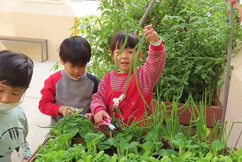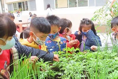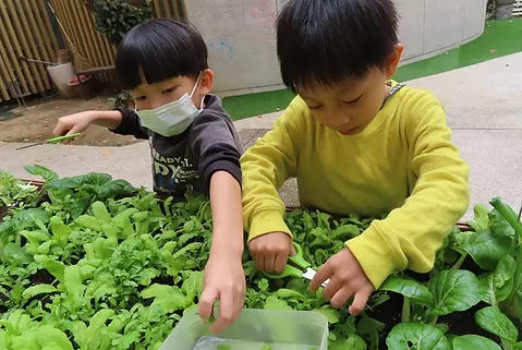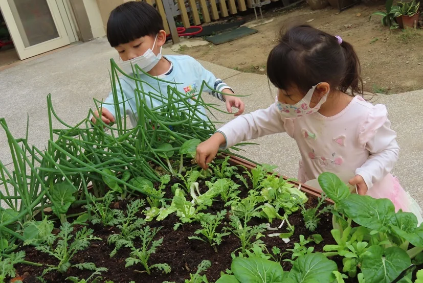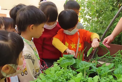 在校園中,孩子們好奇到底有什麼蔬菜可以在烹飪區料理?