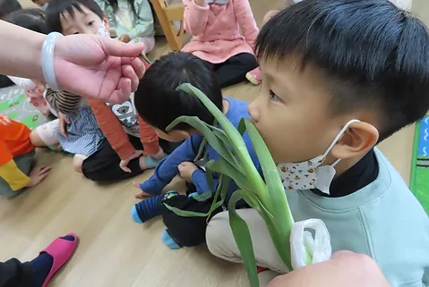 延續探究蔬菜的氣味,老師就地取材,請孩子觀察常作為調味香料的綠色植物—蒜和蔥。他們聞起來像什麼?孩子有各式各樣的形容;和其他蔬菜相比,他們聞起來味道重嗎?孩子的回應模稜兩可,進一步發現「切開」便有明顯的氣味。