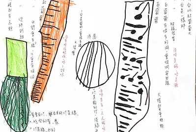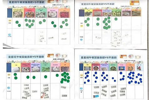 孩子們經由每天觀察、紀錄討論中午吃的蔬菜後,在中午午餐吃完後投票自己最不喜歡和愛吃的料理,在投票的過程中發現,孩子遇到最大的問題還是深綠色的蔬菜,但為什麼深綠色蔬菜孩子不喜歡?孩子們已經有了共同的困境經驗,蔬菜給我們口味和口感的挑戰,在討論中,孩子們自然想到了解決方式(配著其他東西吃),這些都是好辦法。老師期待乘著孩子的解決動機,也正值寒假前夕,於是安排孩子假期中與家人共同進行第一次的實驗—把比較不敢吃的菜畫下來、料理它、品嚐它,並實錄料理過程,開學與大家分享。