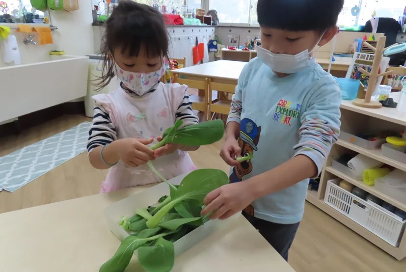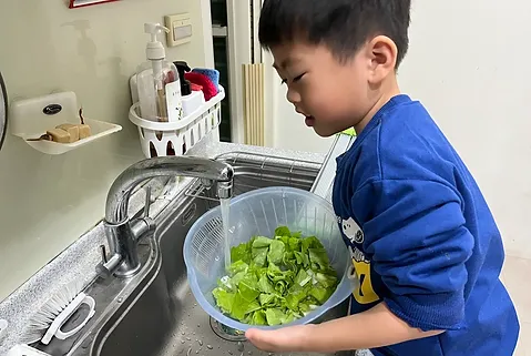 孩子對烹飪工作躍躍欲試,但烹飪可沒那麼簡單,有許多需要準備的事喔!老師請孩子觀察、問身邊的家人有關煮菜的前置工作,孩子們紛紛獲知「菜髒髒的要洗一洗」、「搓一搓、泡水泡很久」、「菜有毒,要把它洗乾淨」、「菜有農藥,吃下去會生病也會死掉」……。所以孩子在烹飪區要先學習處理青菜,包括挑菜和洗菜。