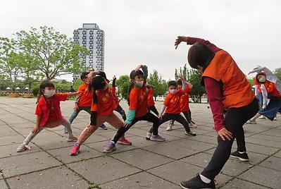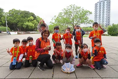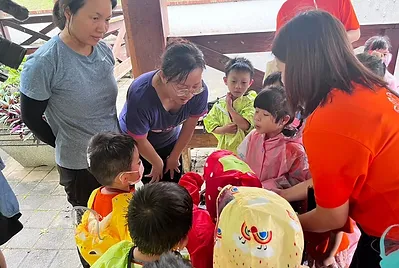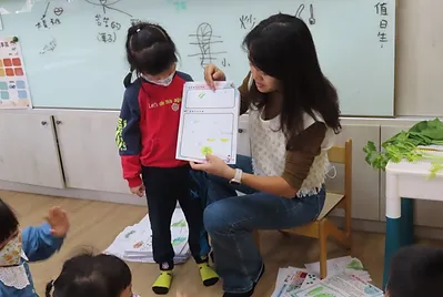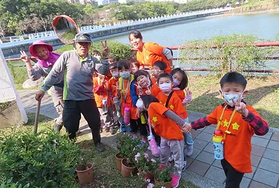 小朋友之前到靜心湖玩光影活動時,有跟打太極的爺爺奶奶互動。第二學期在去靜心湖,老師有與小朋友約定到靜心湖遇到人,要有禮貌地主動與他人打招呼,當小朋友主動與打太極奶奶互動時,奶奶很熱情與小朋友聊天,並教導他們打太極,這是小朋友第一次主動與不認識的人互動,也是一個美好經驗。
