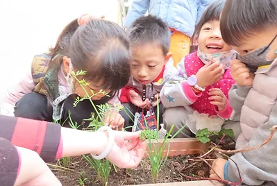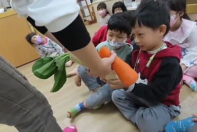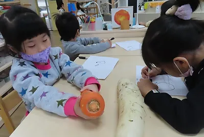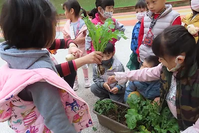 某天中午的餐點有紅蘿蔔與白蘿蔔,小朋友藉由五官去認識紅蘿蔔與白蘿蔔,他們發現蘿蔔摸起來的質地比較硬,且外型與之前吃的蔬菜都不一樣,老師藉由資訊型繪本與幼兒解說蔬菜有根、莖、葉、果實、花等部位,之前所吃的蔬菜是吃它的莖與葉,蘿蔔則是吃它的根,根是長在泥土裡,但小朋友對於沒有實際操作過的事物,存有較多的疑問,剛好幼兒園有種白蘿蔔與紅蘿蔔,請小朋友動手把蘿蔔,經由採收的過程,小朋友能理解蘿蔔就是植物的根,而我們平常吃的就是蘿蔔的根。