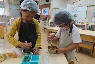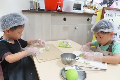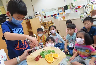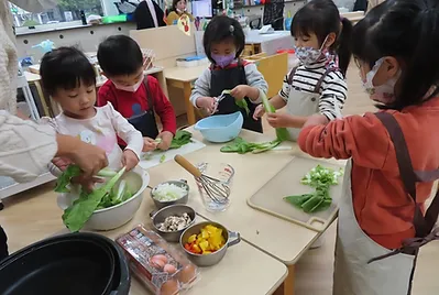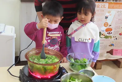 老師開始為孩子調整環境,為探討深綠色食用植物的風味,可以自己動手在「烹飪區」進行料理實驗;並向已經有烹飪經驗的大班學長姊請益,了解所需裝備、事前準備和烹飪區的功能。孩子們好興奮喔,烹飪區是可以煮「真的」喔!