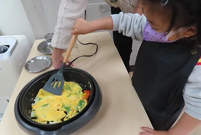 準備好配料之後,我們就要開始煎了,孩子們將不同的配料加入蛋攪拌,總共分為青菜加蛋和洋蔥、香菇、紅椒黃椒三盤不同的煎蛋蔬菜料理,在煎的過程中,孩子們發現蛋一開始打在杯子裡是一體狀態的像鼻涕一樣黏黏的、水水的,但下鍋煎一煎,會發現蛋會凝固,而且顏色也會變成皮膚的顏色、有些孩子會發現蛋會先從邊邊開始熟了,因為旁邊的蛋比較少,越少蛋的地方的地方會越先熟。