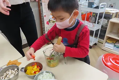 從孩子們在家中料理的過程中,發現有一些小孩會把蔬菜加入蛋下鍋一起煎,而上一次在討論炒的料理時,孩子有提到青菜可以搭配其他的東西一起炒,所以這次我們準備了洋蔥、香菇、紅椒、黃椒、雞蛋加入蔬菜一起下鍋煎,而要準備不同的配料孩子們在學習區裡一起分工合作,有人負責洗菜、切菜,有人負責切洋蔥、紅椒、黃椒、香菇,孩子們學習怎麼樣備料,將蔬菜切成丁狀。