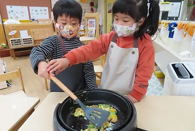 自從小朋友分享在家做的料理後,對烹飪料理的方式有基本瞭解,他們知道料理有炒、煎、煮、燙、蒸、米食料理這幾種,於是這幾週小朋友開始探究,如何藉由炒的方式讓食物變的美味,並解決之前討厭吃蔬菜的原因(菜有苦味、纖維太長不好吞),小朋友炒了四盤菜,分別是「第一盤:油+蔬菜」、「第二盤:油+蔬菜+鹽巴」、「第三盤:油+蔬菜+鹽巴+蒜頭」、「第四盤:油+蔬菜+鹽巴+蒜頭+水」,之後請他們試吃,並票選出自己喜歡的那盤菜,結果發現第二盤菜最多人選有5票、第三與第四盤各有4票、第一盤只有1票,但在分享自己喜歡此盤菜原因時,小朋友的想法有太多不一樣,如「加鹽」讓菜變甜、「加油」讓菜變鹹、「加蒜」讓菜變鹹、「加鹽」讓菜變鹹、「加蒜」讓菜變香等,為了讓小朋友進一步釐清想法,決定隔天要在炒兩盤菜試吃看看,到底是加了什麼東西讓蔬菜變香、變鹹、變美味的原因。