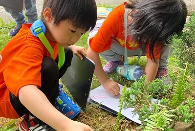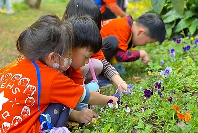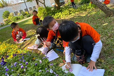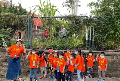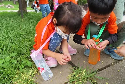 我們到靜心湖探索哪裡有艾草,在探索的路途上,我們遇到庭院前停了一台大卡車,孩子們好奇之下尋找發現是栽種杜鵑花的叔叔,孩子們觀察叔叔是如何種植杜鵑花的,也順道詢問艾草在哪裡,並在繼續探索靜心湖之旅上,孩子在中國庭院裡面,打開眼睛、鼻子以及手去觸摸探索小花園裡有什麼新的發現?
