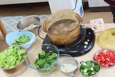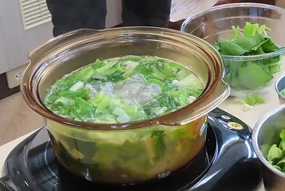 第三種料理孩子們分享是用煮湯、火鍋的方式,而不同的蔬菜孩子們用的湯也是不一樣的,有的用小白菜加入柴魚高湯包、茼蒿火鍋、九層塔加入熱高湯。