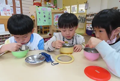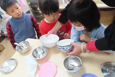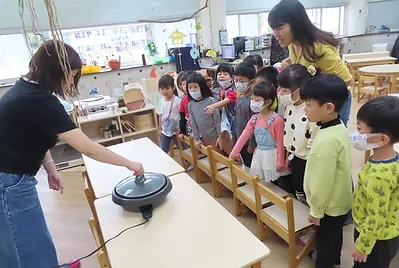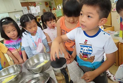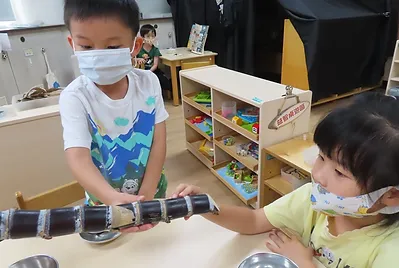 老師煮了一鍋熱水,讓孩子發現用煮滾的水上面有冒泡、冒煙,而且感覺很燙。老師詢問煮的和燙得有什麼不一樣?孩子們發現煮的湯可以喝、燙青菜的水不能喝。