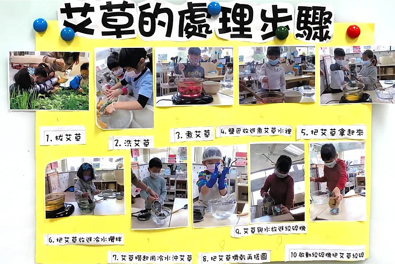 孩子們每天細心的呵護照顧艾草,幫艾草除草、澆水發現艾草越長越茂盛,孩子們想到我們可以一起來製作艾草相關的料理,沿著之前孩子們有吃過艾粄的經驗;有些孩子有在家裡和家長一起料理艾粄的經驗,於是我們決定要到烹飪區一起研究如何做出好吃的艾粄。