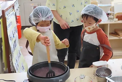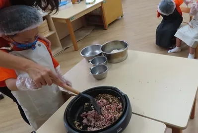 甜的餡料我們準備的是紅豆餡,將紅豆泡水後發現經過一夜的紅豆變得很大一顆,之後我們放進電鍋蒸熟,再放入炒鍋裡翻炒,翻炒需要時間以及火候的掌握,孩子們觀察到紅豆經過不斷的翻炒,從紅豆水變成一團泥狀就完成了~