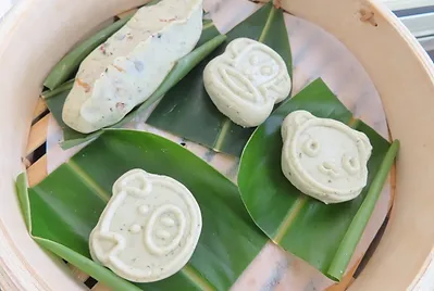 我們試著用不同的龜印、板模也印出不同造型代表不同的意義,有烏龜、桃子代表長命百歲、錢幣代表賺大錢;還有更多可愛的造型圖案,分享給學校的同學、主任、老師、廚房阿姨、營養師一起分享,一起在清明節前夕分享這好吃的客家菜包(草仔粿)美食。