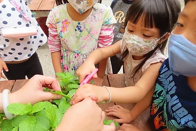 孩子們從靜心湖發現到許多很香的植物,例如:芳香萬壽菊、薄荷、檸檬香蜂草、左手香、桂花……,除了艾草可以做成好吃的艾粄,他們也想研究看看要怎麼把這些香草植物泡成好喝的茶搭配艾粄。