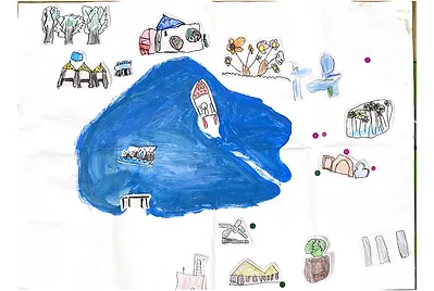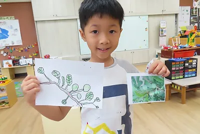 回到教室我們一起看照片,回憶可食植物的生長處,發現小朋友的空間方位越來越好,第一次在討論方位,只標一個可食植物,小朋友就需要花好長的時間去釐清標地位置,此次我們發現10種以上的可食植物,小朋友在短短40分鐘內完成標地位置,並能清楚的說建築物與植物的關係位置,如香蜂草在廁所與湖水的中間、腎蕨在新小花園拱門兩側等;最後,請小朋友幫忙,將在靜心湖拍的可食植物畫下來,並貼在地圖裡。