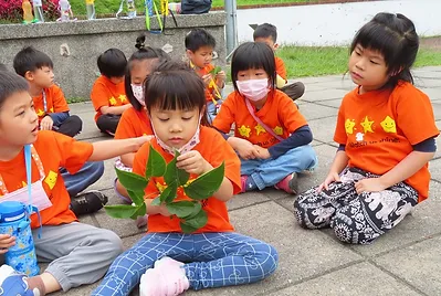 最近開始小朋友在學習製作艾粄,小朋友知道艾粄下面墊的月桃葉,於是老師特地找了月桃葉給小朋友觀察,小朋友從觀察月桃葉的形狀、顏色、及味道來認識它,並請他們幫忙仔細觀察生活周遭哪裡有月桃葉。