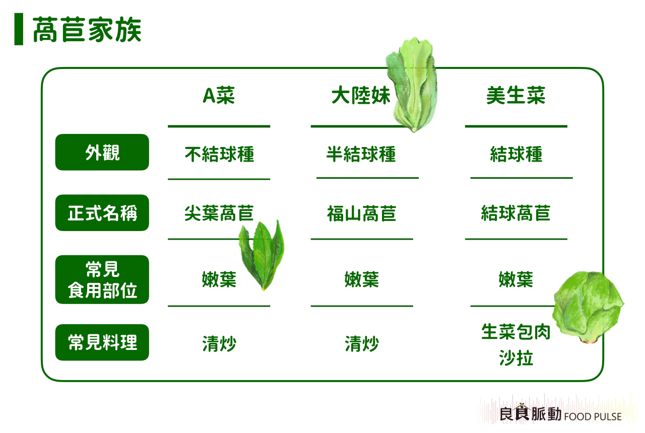 你是不是覺得A菜、美生菜和「大陸妹」的味道或口感有些類似呢?其實,這並不是錯覺,因為這些菜都是屬於萵苣的一種,而這些菜命名又從何而來呢?市面上又有哪些農產品是同樣品種的呢?一起來認識這些同種但外觀不太一樣的栽培種蔬菜。