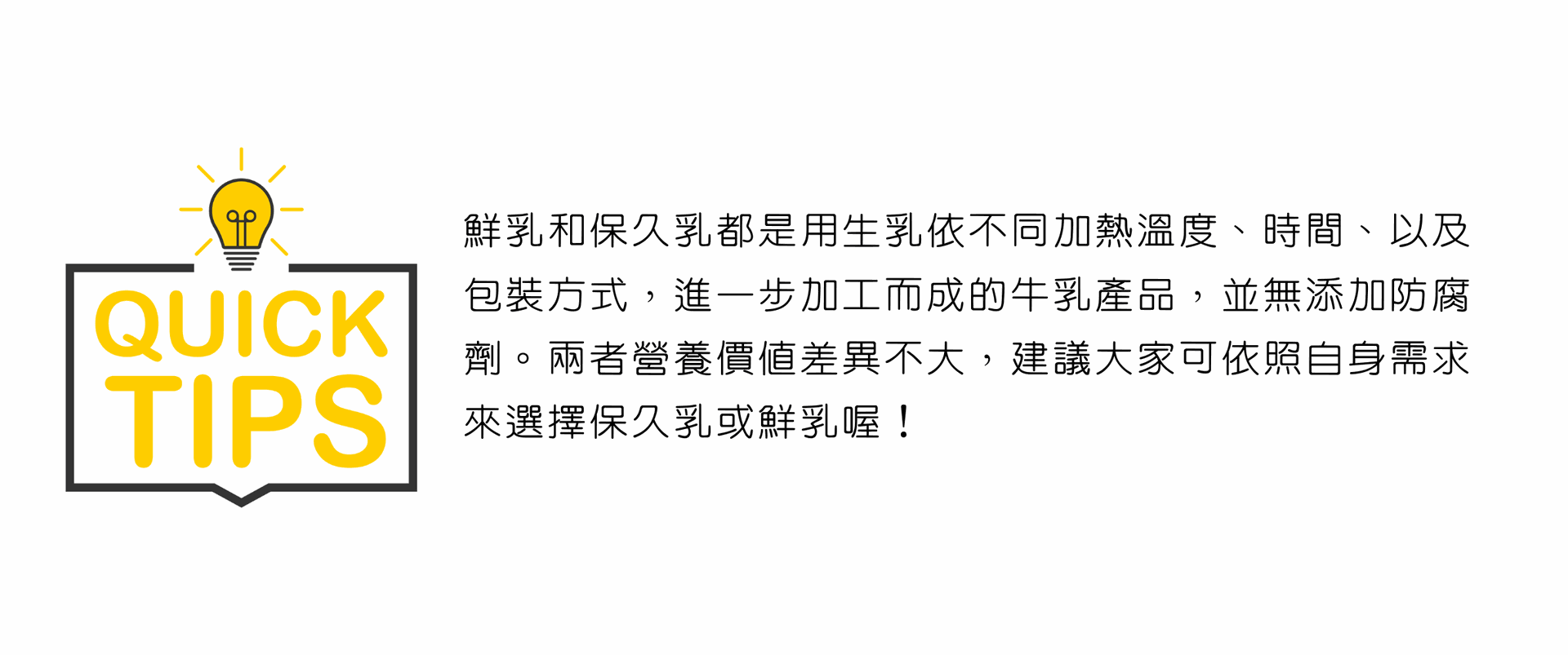 除了少數不耐熱的營養素含量可能有些差異外,保久乳和鮮乳營養價值實際上差異不大;甚至,保久乳擁有常溫保存的優勢,是出外遊玩時補充體力的好夥伴!因此建議大家可依照自身需求來選擇保久乳或鮮乳,如果缺乏冷藏設備或無法一次喝完,建議選擇可在室溫保存的保久乳;但如果喜歡鮮乳的口感,可以選擇鮮乳,但要注意趕快喝完或妥善保存於冰箱中!