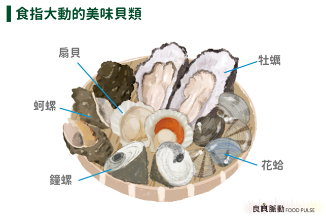 - 扇貝:生長範圍廣闊,在潮間帶至深海都可能看到他的身影,平常會用足絲附著在淺海岩石或沙質海底生活。扇貝品種多,較常被食用的有帆立貝、海灣扇貝等,最常見的烹調方式是「烤」,只要在上面灑些香料、調味,就能烤出來湯汁豐富,又美味的扇貝料理囉!