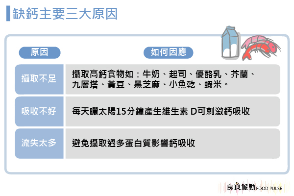 - 攝取不足:乳製品像牛奶、起司、優酪乳等,是最容易攝取的高鈣食物,另外像綠色蔬菜芥蘭、九層塔、黃豆與黃豆製品、黑芝麻、小魚乾、蝦米等也是很好的鈣質來源。每天如果沒有足量攝取高鈣食物,自然就會缺鈣。