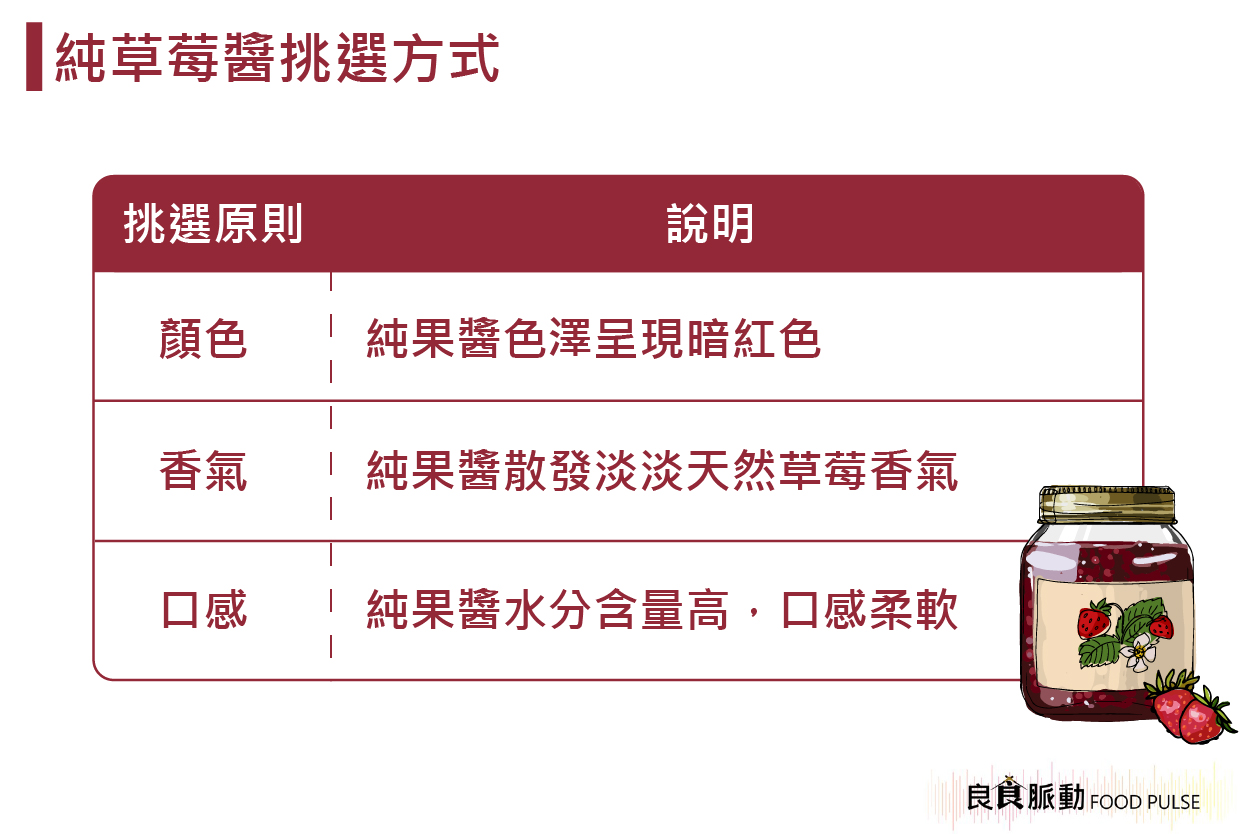 - 口感:純果醬水分含量較高,口感柔軟,不一定有大顆草莓,但可看出草莓籽較多;添加其他成分的果醬口感較硬,吃起來有股類似吉利丁等的膠質感。
