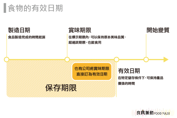 - 有效期限:在特定儲存條件下,市售包裝食品在有效日期內可保持產品價值並且安全食用,涵蓋外觀、味道、質地、風味以及營養標示,例如維他命、抗氧化劑等,過期就不可再用。