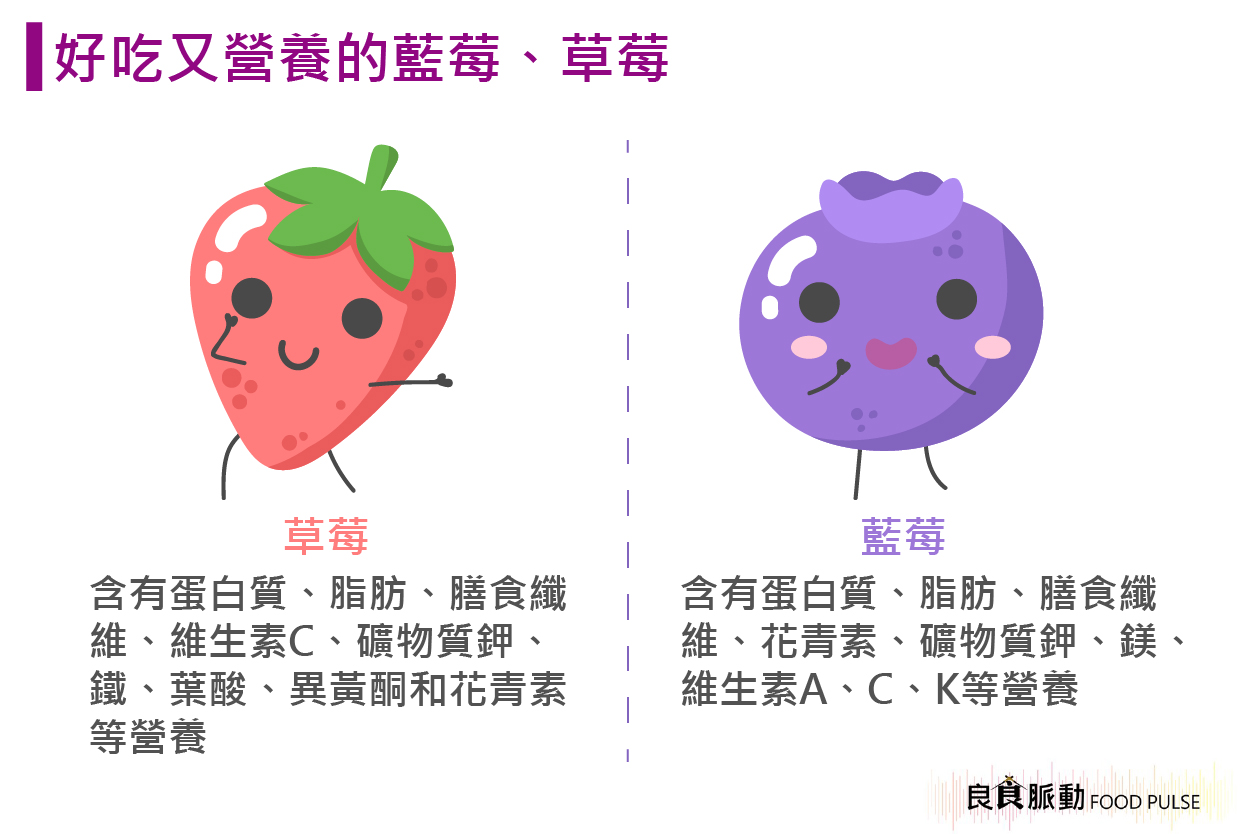 藍莓屬於杜鵑花科之下常綠灌木越橘屬的植物,雖然小小顆,別致的藍色卻十分美麗,令人印象深刻,在美洲、非洲、澳洲、歐洲等許多地方出產;草莓則屬於薔薇科草莓屬大家族,原產地是南美洲,如今在世界各地都有栽培,苗栗縣大湖是台灣的主要產地,鮮艷欲滴的顏色很討孩子喜歡。