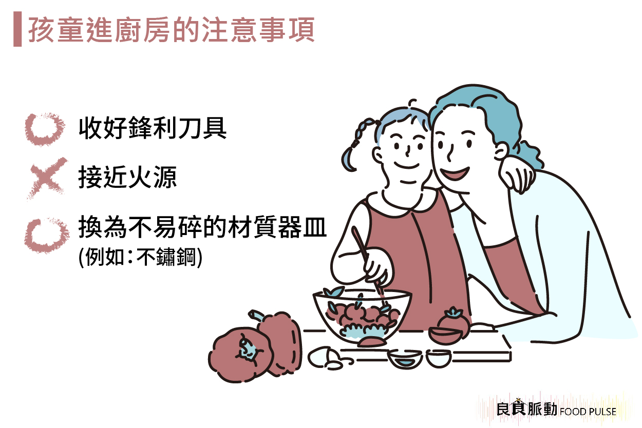 要讓小孩進廚房,一定會有一些疑慮,例如:怕孩子不小心燙傷、或是被刀具劃到。所以事前準備還是有的。
