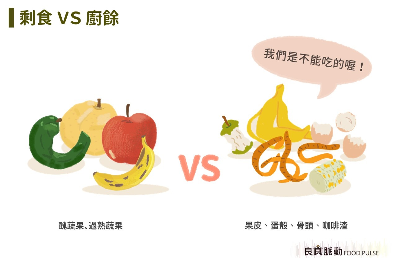 剩食跟廚餘有什麼不同呢?我們可以用「還能不能吃」這種簡單的方式來區分。「剩食」是指已過了賞味期限,但未過保存期限、賣相不佳、商家貼錯標籤或包裝出錯導致無法販賣但仍可食用的食材;而「廚餘」則為丟棄之生、熟食物及其殘渣,像是不可再食用的果皮等。兩者最大的不同點在於,「剩食」為仍然可食用,卻被人們丟棄的食物。