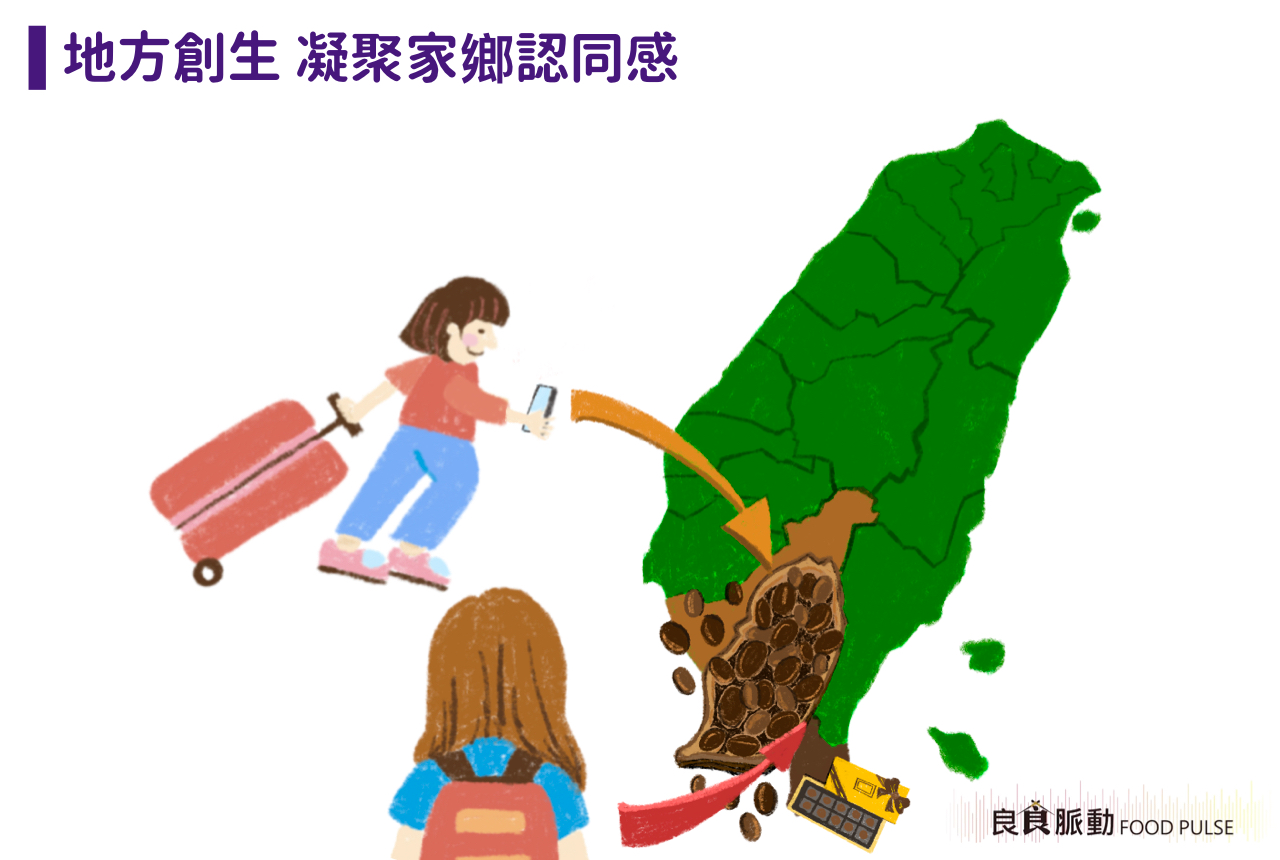 農業是臺灣的根基產業之一,因爲環境得天獨厚,各地都有適產的農作物,可以透過各地的特產農作物,連結起人對土地的情感。以屏東縣的可可為例,屏東是全球最北的可可產區,甚至在地人都不清楚自己的家鄉產可可豆,整合產地到餐桌概念,有品牌就讓原豆巧克力從種植、研磨發酵到製造加工都在當地完成,更結合各地代表食材像是馬告、茶葉等,推出創新口味,在國際競賽中屢獲佳績,這就是利用家鄉農業發想融入地方創生精神的卓越成果。
