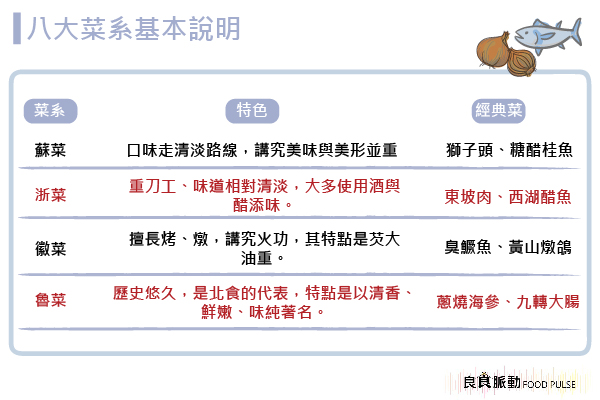 中華料理主要可分為八大菜系,包含:川菜、湘菜、粵菜、閩菜、蘇菜、浙菜、徽菜跟魯菜,在台灣是以浙菜為居首,反應當年隨著蔣介石來台的統治階層。江浙菜注重刀工、味道相對清淡,大多使用酒與醋添味。海鮮河鮮比例多,例如松鼠黃魚、文思豆腐、鎮江肴肉、清蒸鰣魚。乾製鹽製菜餚著名,包括南京板鴨、桂花雞、醬鴨、金華火腿與各式臘肉。台北「南門市場」依舊可見上述肉品。