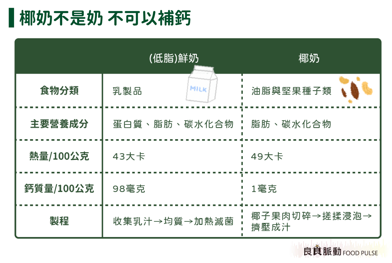 依據食品營養專家鑑定,在六大類食物中,椰奶屬油脂與堅果種子類,營養成分和牛奶所屬的乳品類有很大差異。同樣重量下,椰奶的蛋白質、鈣質總量比牛奶少,主要提供的營養素為碳水化合物,因此椰奶並不能取代牛奶,作為乳品類的來源。