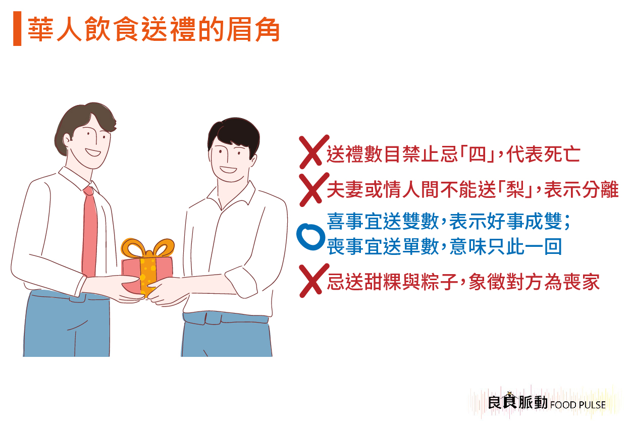 飲食文化上,華人流傳夫妻或情人間不能送「梨」,「梨」與「離」諧音,不吉利。中國的傳統忌送甜粿與粽子,因為它們是喪家不做的食物,若贈人此物,像是在暗指對方為喪家之意。
