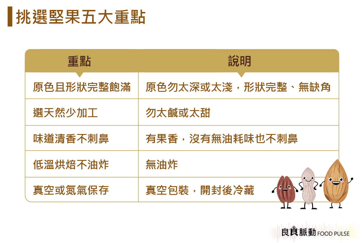 - 選「原色」且形狀完整飽滿的:堅果都有屬於自己的果色,過白可能是經過漂白處理,過深可能是烘烤過度或放置太久變色,營養成分流失,購買時應挑選形狀完整、無缺角、果實飽滿、表面無蟲蛀和斑點的堅果為佳。