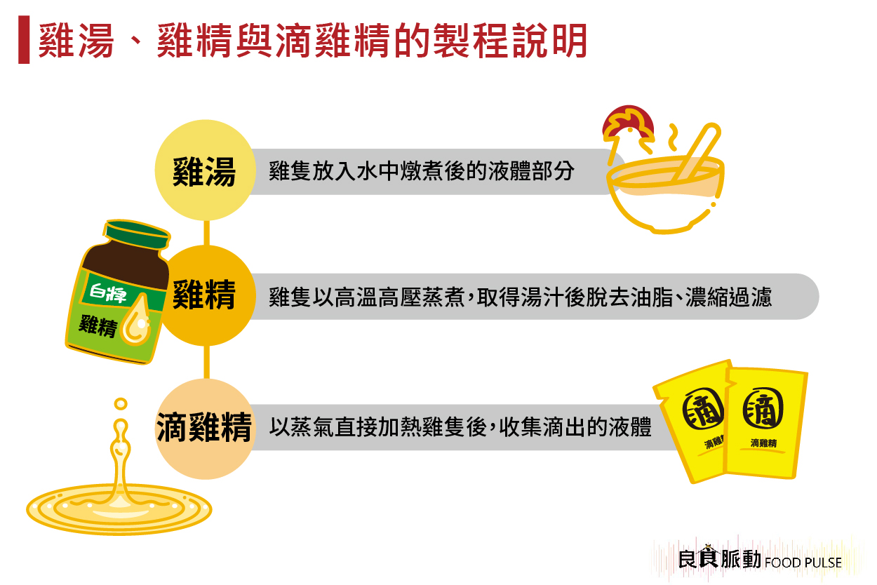 製作過程不同:雞湯是雞隻放入水中燉煮後的液體部分,雞精則是濃縮的雞湯。雞精製作時將雞隻以高溫高壓蒸煮,取得湯汁後脫去油脂、濃縮過濾,就是雞精。滴雞精則是用以蒸氣直接加熱雞隻後,收集滴出的液體,能產生的液體量較少,因此價格也較高。