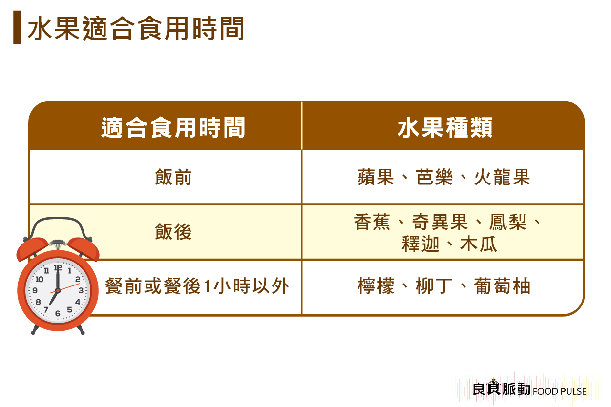 有些水果含有豐富的膳食纖維、增加飽足感又不會讓腸胃不舒服,適合餐前吃,例如蘋果、芭樂、火龍果;對於腸胃機能健康的人來說,在兩餐當中吃點酸味高的水果無妨。